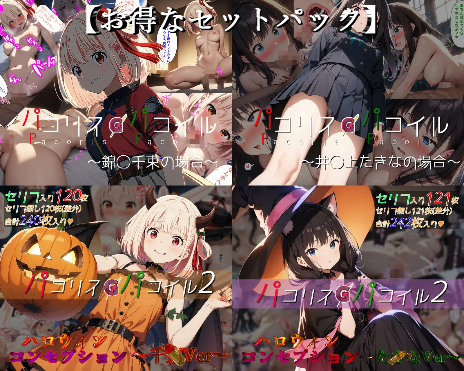 パコリス・パコイル〜錦木◯束の場合〜、パコリス・パコイル〜井◯上たきなの場合〜、パコリスパコイル2:ハロウィンコンセプション〜千◯Ver〜、パコリス・パコイル2:ハロウィンコンセプション〜た◯なVer〜の4つに加えて、1stシーズンセットパック特別CGと2×2セットパックおまけCGよ